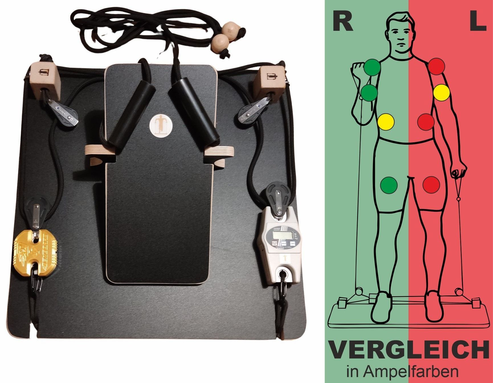 - Rückenstyler Analyseboard mit zwei getrennten Messeinheiten (1 x analog und 1 x Bluetooth) und Seilzügen für den automatischen Rechts-links-Muskelvergleich